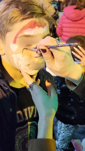 Ένα από τα πιο αγαπημένα σημεία θα είναι και φέτος η γωνιά της ζωγραφικής προσώπου. Θα γεμίσει με χρώματα, με πινέλα και όλες τις Χριστουγεννιάτικες εμπνεύσεις. Αναδεικνύουμε τις εικαστικές ικανότητες των παιδιών μέσα από την επιλογή χρωμάτων και σχημάτων πάνω στον καμβά του προσώπου. Ειδικότερα, τα παιδιά επιλέγουν το θέμα. Παράλληλα γνωρίζουν τα χρώματα και τα σχήματα με την βοήθειά μας.