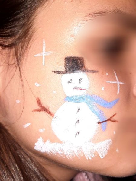 Με την μαγική αστερόσκονη και χιλιάδες οικολογικά χρώματα, τα σκανδαλιάρικα ξωτικά, οι παιχνιδιάρικοι καλικάντζαροι, οι μικροί νάνοι και οι χαμογελαστοί χιονάνθρωποι μεταμορφώνουν τα προσωπάκια όλων των παιδιών. Χρωματίζουν δηλαδή τα παιδικά προσωπάκια με καταπληκτικά χριστουγεννιάτικα και γιορτινά σχέδια. Συγκεκριμένα, τα μεταμορφώνουν σε Ρούντολφ το ελαφάκι, Άγιο Βασίλη, χιονονιφάδες, πολικές αρκούδες, πανέμορφα χριστουγεννιάτικα έλατα, δώρα, ζαχαρωτά, λαμπερά αστέρια, λαμπιόνια και πολλά πολλά άλλα. Ο καλλιτέχνης μας ενδεικτικά θέλει 3-5 λεπτά για το κάθε παιδάκι.